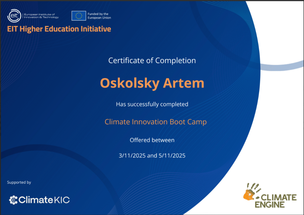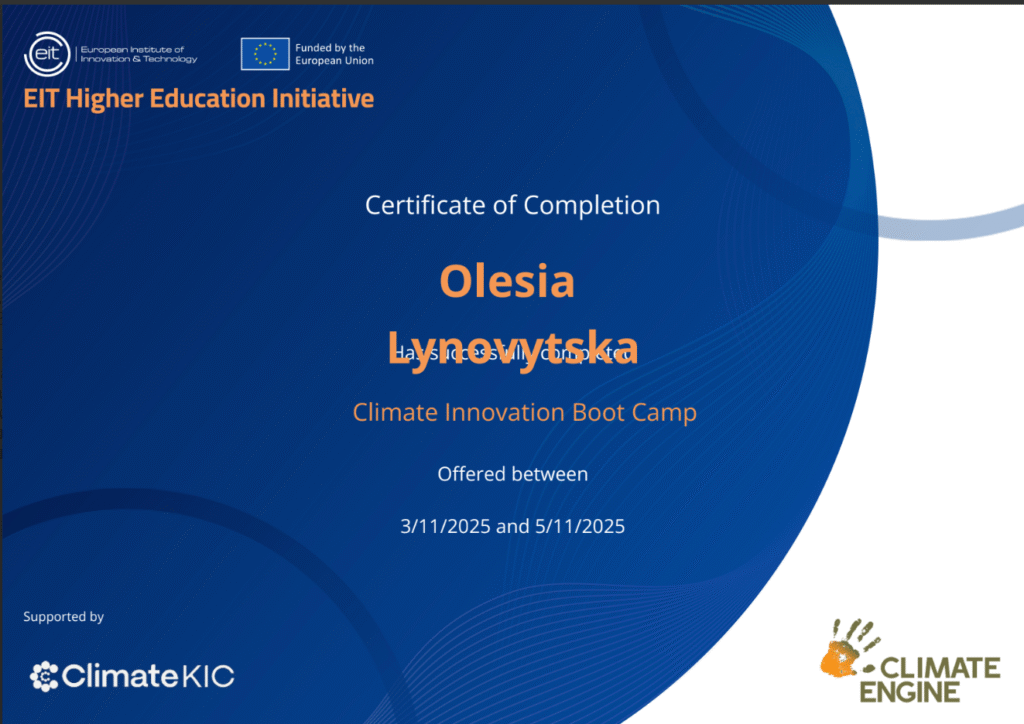 У межах реалізації проєкту Climate Engine систематично проводяться тренінги, семінари та практичні сесії. За активну участь у цих заходах представники Київського аграрного університету НААН — перший проректор, професор Олеся Линовицька,  вчений секретар, доцент Андрій Дінець та аспірант Артем Оскольський — отримали сертифікати про успішне проходження навчальних модулів, зокрема Climate Innovation Boot Camp.