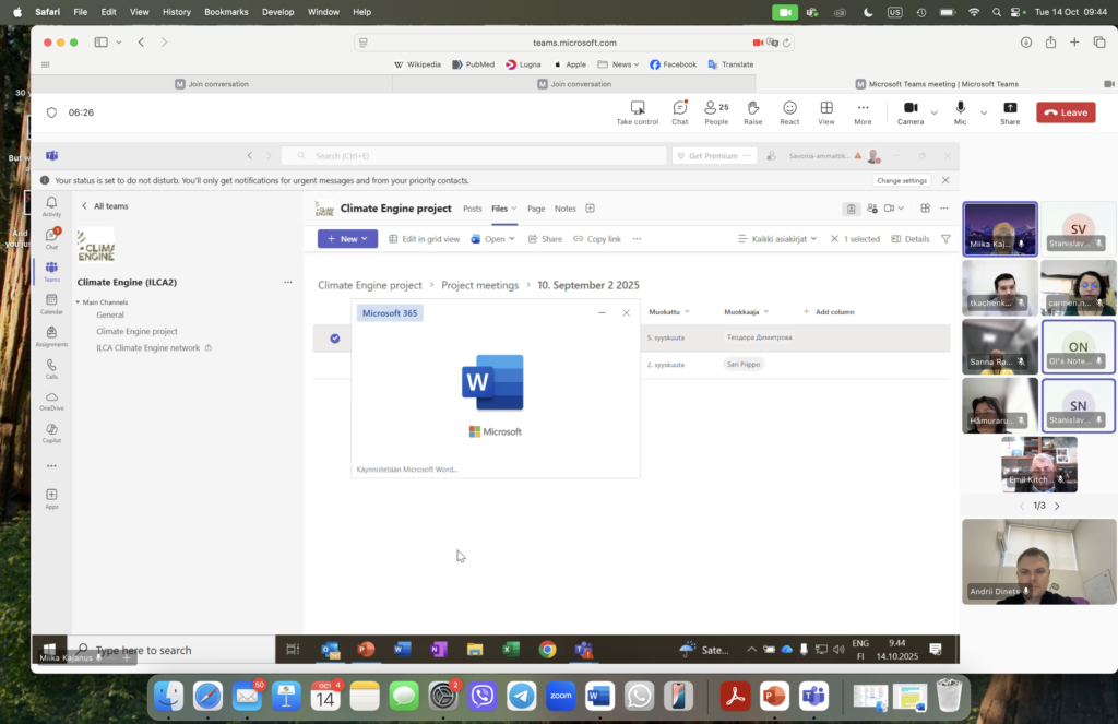 03 лютого 2026 року відбулась робоча нарада семінар з обоговорення деталей щодо реалізації проєкту Climate Engine, присвячений визначення стану виконання засад проєкту його учасниками з застосуванням дистанійної технології Teams. Київський аграрний університет впроваджує частину інновацій, зокрема створення іноваційних лабораторій на базі університету. У семінарі взяли участь представники з України, та загалом 13 партнерських організацій, серед яких заклади вищої освіти, зокрема наш університет, а також українські та міжнародні бізнес-структури: International Society for Professional Innovation Management, Університет Короля Данила, Молдовський державний університет, Національний науковий центр «Інститут землеробства НААН», Nokia Solutions and Networks, Savonia University of Applied Sciences, Stefan cel Mare University of Suceava, Humak University of Applied Sciences, The University of Chemical Technology and Metallurgy, University of Forestry, Чернівецький національний університет імені Юрія Федьковича.